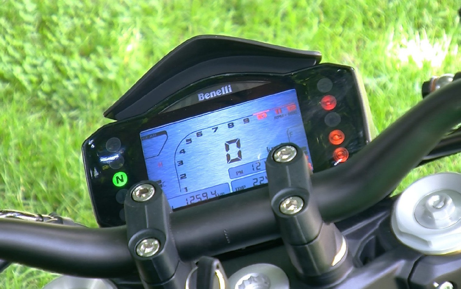Il lato estremamente positivo della mancanza dell’elettronica è che Benelli ha potuto proporre la moto a un prezzo invitante, considerando che la dotazione tecnica è decisamente interessante, a cominciare dall’ottimo impianto frenante radiale Brembo e dalla Forcella Marzocchi, per finire con fari e frecce a led. Pregevole la protezione metallica della pompa dell’acqua, mentre il bocchettone di rifornimento sporge troppo e sporca un po’ la linea del bel radiatore ricurvo. La dotazione prevede anche un display TFT a colori, dotato di sensore crepuscolare molto utile perché cambia automaticamente lo schema cromatico del quadro strumenti per adattarlo alla luce diurna e notturna. Come notato su altri modelli della Casa, anche in questo caso inspiegabilmente modifica la disposizione degli strumenti passando da una modalità all’altra. Nulla di grave, ma il riposizionamento risulta un po’ fastidioso. Manca un vero e proprio computer di bordo, in grado per esempio di fornire consumi medi e istantanei, ma le informazioni di base ci sono tutte: oltre tachimetro e contagiri troviamo infatti indicatore di marcia innestata, livello carburante, ora e contachilometri totale e parziale, oltre alle immancabili spie e la particolarità della scritta Benelli illuminata nella parte superiore proprio sopra l’”unghia” protettiva, che sembra fatta apposta per essere rimpiazzata da un cupolino sportivo.