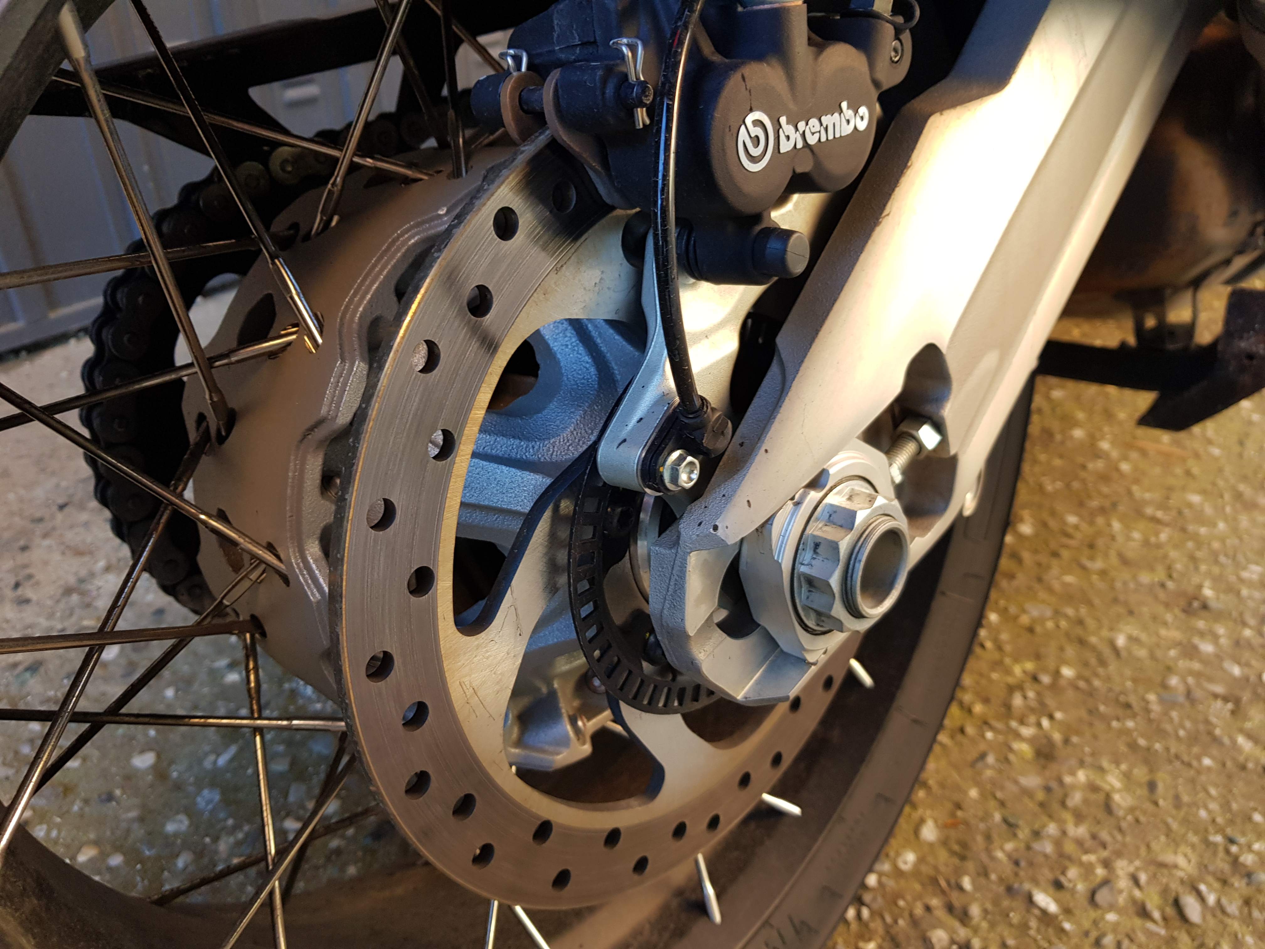 Scarico completamente rivisto rispetto la multistrada stradale, dove le due uscite si chiudono dentro un terminale più sottile e lungo, il sound è bello pieno e si guadagna un può di spazio per la valigia laterale sinistra.