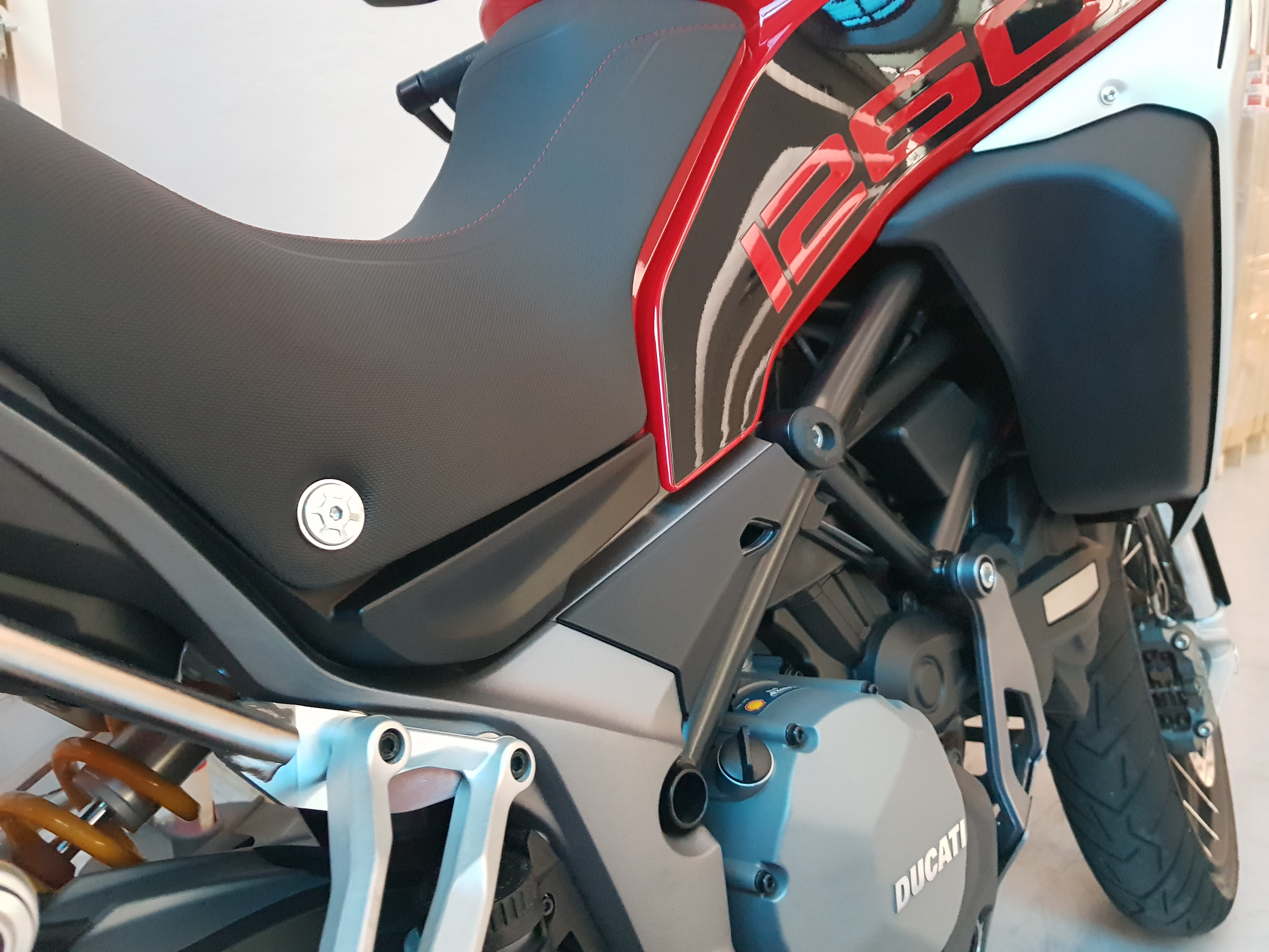 Elettronica raffinata, come Ducati ci ha abituato anche sugli altri modelli, dove 4 Riding mode (Urban-Touring-Sport-Enduro), creano un setup subito pronto, ma personalizzabile, inseribile anche in movimento per cambiare “passo” durante la guida. Tre modalità di utilizzo del motore, il basso che diminuisce la potenza a 100CV e addocilisce la coppia, l’intermedio addolcisce solo l’erogazione, il full e tutto a massima potenza. Addentrandoci negli altri parametri troviamo, anti-impennata, Traction control, Setup forcele (le Skyhook semi-attive), precarico, ABS e Cambio elettronico. Ad oggi una delle più esaustive configurazioni possibili, e non solo. Ducati affianca la sua App Ducati Link, che aggiunge la possibilità di usare il telefono per il setup oltre a pianificare viaggi e storico delle proprie escursioni.