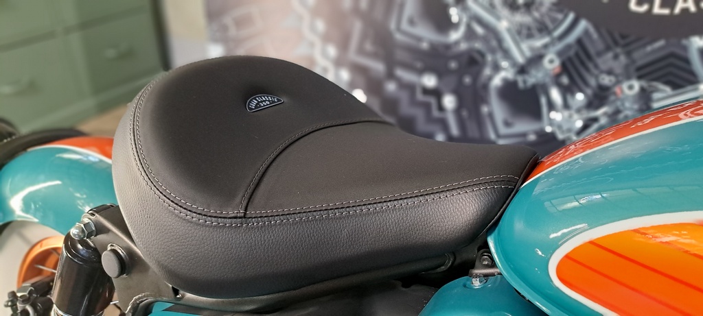 Questa piccola creazione artigianale di Royal Enfield si presenta con una verniciatura davvero spettacolare chiamata Trip Teal, ispirata ai tradizionali mandala realizzata con tonalità a contrasto che vanno dall’arancione al verde acqua, e dettagli che la rendono una piccola bobber da godere in solitaria o in coppia, visto che di serie viene fornito un grande sellone singolo ma anche la sella aggiuntiva per il passeggero da montare all’occorrenza e che si integra molto bene nella linea lasciando il parafango posteriore bene in vista.