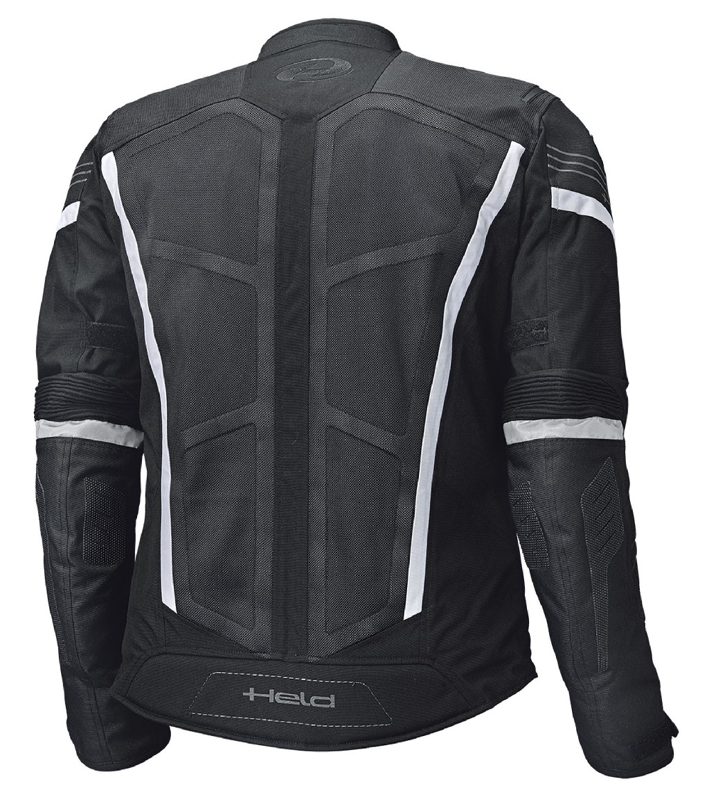 – Regolazione in vita e cerniere per l’aerazione. Nella parte interna del braccio, all’altezza del gomito, è presente una zona “stretch” (allungabile). Le maniche regolabili, gli inserti anteriori e posteriori riflettenti in tutta l’area “mesh”, la tecnologia Held “Clip-In” (il sistema di aggancio dedicato ai pantaloni) e il colletto in morbido tessuto completano le caratteristiche funzionali ed estetiche