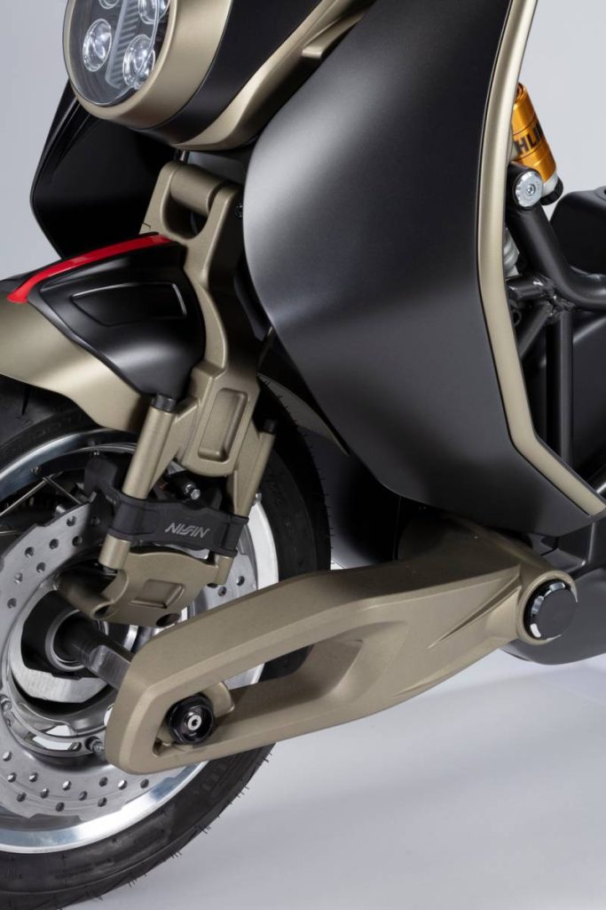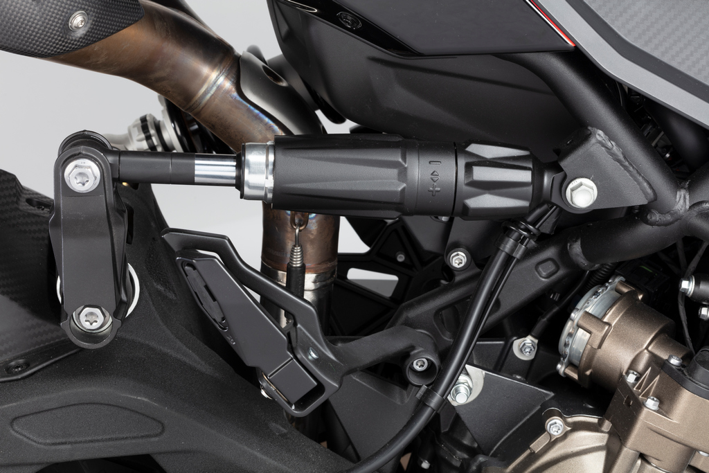 Ogni elemento è progettato per catturare lo sguardo: dai cerchi a raggi in alluminio, alla struttura in alluminio a vista sotto la sella ispirata ai collettori di aspirazione dei motori automobilistici da competizione, fino all’impianto di scarico a doppia uscita Akrapovič che incornicia l’ammortizzatore posteriore centrale.