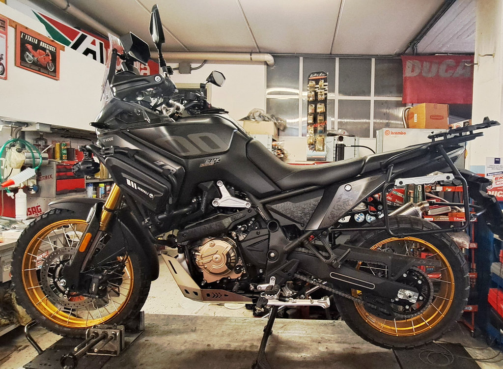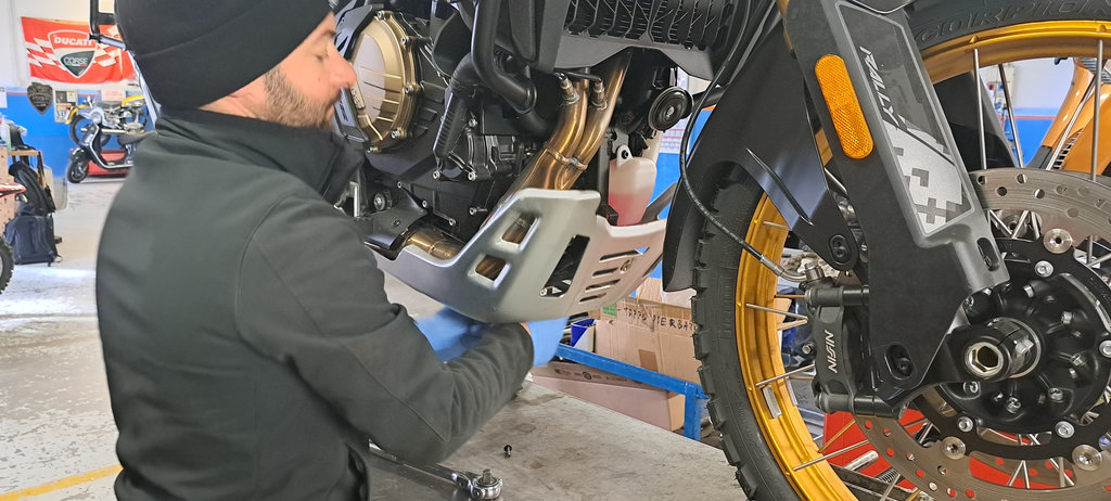 L’installazione può essere fatta anche da soli ma sicuramente in due è più semplice. Noi ci siamo fatti aiutare da Mototecnica di Zogno (BG) durante una sessione in cui abbiamo installato anche altri componenti soggetti a test e il fatto di mettere la moto sul banco ha facilitato sicuramente il lavoro. Tutto può però anche essere fatto nel box di casa, anche perché la Voge 800 Rally di serie offre anche il cavalletto centrale su cui issarla per lavorare meglio nella parte inferiore.