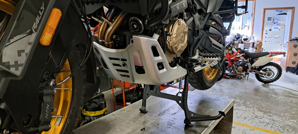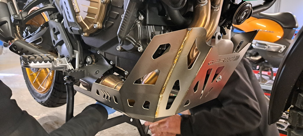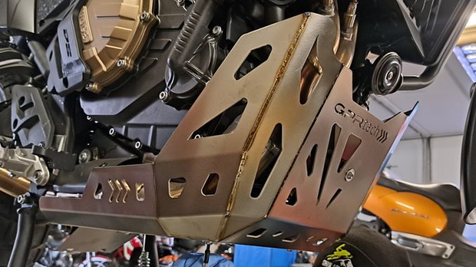 Di serie lquesta moto esce già con una ricca dotazione che prevede tra le altre cose anche un paramotore in metallo, che però è pensato per un utilizzo prevalentemente stradale e in caso di guida in offroad presenta alcune lacune, prime tra tutte il fatto che lascia particolarmente esposto il serbatoio del liquido refrigerante e il leveraggio progressivo dell’ammortizzatore posteriore. La cosa curiosa è che sul telaio ci sono già due punti di fissaggio per una protezione estesa, come se inizialmente il progetto avesse già previsto un paramotore più protettivo, ma che poi per contenere i costi si sia optato per un modello più corto e meno protettivo.