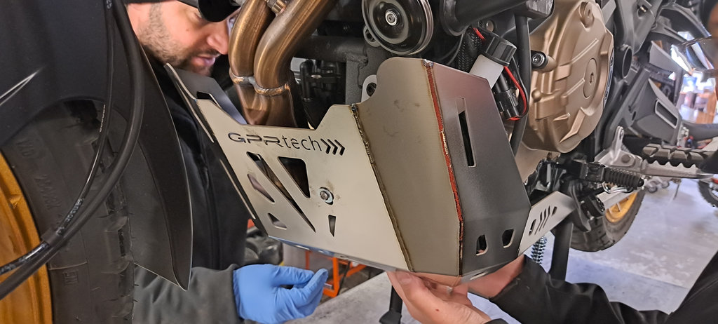 Oltre ad essere realizzato con un materiale particolarmente pregiato il paramotore di G.P.R. è anche rifinito molto bene e il montaggio è davvero semplice in quanto vengono sfruttati gli attacchi originali su cui vanno avvitati bulloni con guarnizioni antivibrazione. Come accennato, rispetto ai punti di fissaggio del paramotore di serie vengono sdeuttati anche quelli supplementari presenti sul telaio per andare ad assicurare saldamente la parte finale a sbalzo che va a proteggere il link progressivo.