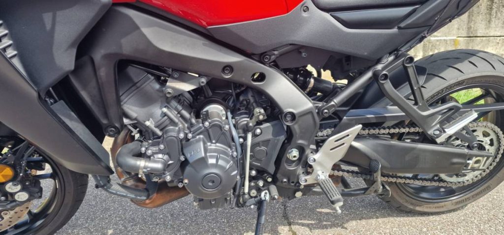 La forza della Yamaha Tracer 9 resta il suo telaio a diamante, dove risiede il motore a 3 cilindri che continua ad essere un riferimento per equilibrio e grinta.