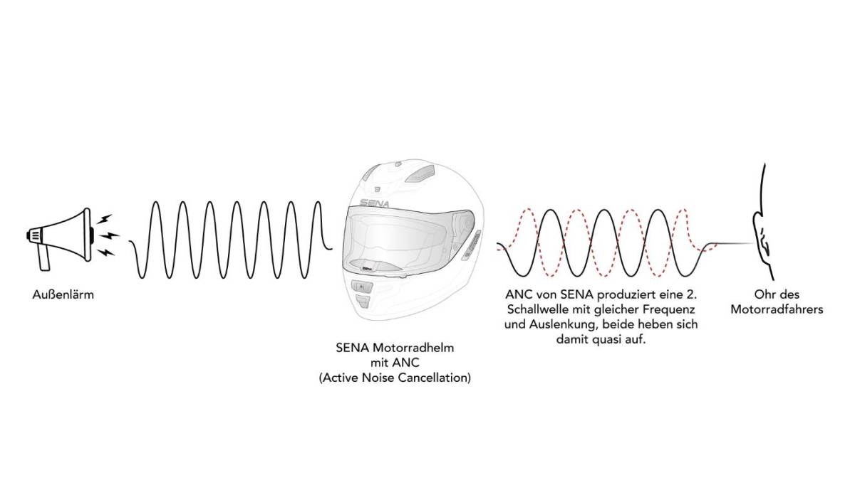 Il principio della riduzione attiva del rumore (ANC) è semplice: il casco capta il rumore ambientale tramite un microfono e genera un’onda opposta per attenuarlo, come illustrato nello schema sottostante.