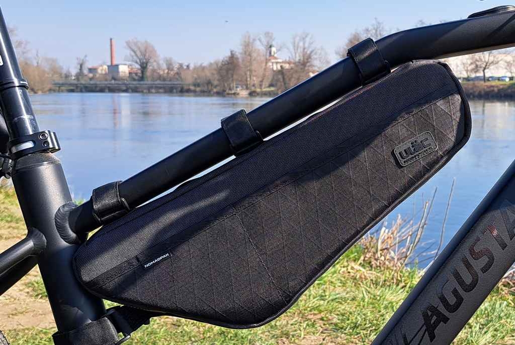 Per il tubo superiore del telaio Ulac ci ha fornito la borsa TOURING GT da 3,5 litri, che ha il vantaggio di poter essere utilizzata in due diverse direzioni. Nel nostro caso, per esempio, non potevamo montarla frontalmente perché sul tubo superiore avevamo i controller del motore Mahle X35 della nostra MV Agusta, ma è stato sufficiente ruotare di 180 gradi la borsa per poterla fissare correttamente assicurandola al tubo verticale sottosella. Sulla gravel abbiamo invece potuto fissarlo frontalmente. Da notare che le tre cinghie superiori con velcro possono essere spostate in differenti posizioni per adattarsi al meglio a vari tipi di telaio e ad altri accessori eventualmente montati sulla bici.