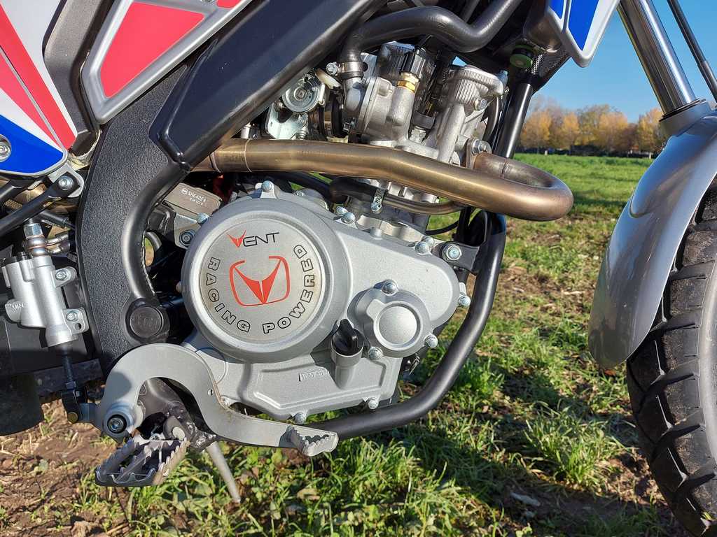 Il motore che equipaggia la Vent Scrambler 125 è il collaudatissimo monocilindrico Minarelli a 4 tempi raffreddato a liquido, alimentato in questo caso con un ottimo carburatore Keihin CVK a valvola piatta da 30 mm di diametro. Non c’è l’iniezione, con relativa pompa della benzina, e questo comporta sia la presenza del “vecchio” rubinetto di chiusura (posizionato in una punto un po’ scomodo quando si è in sella) sia del manettino dell’aria per agevolare le partenze a freddo.