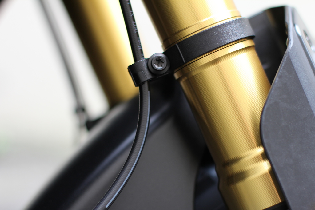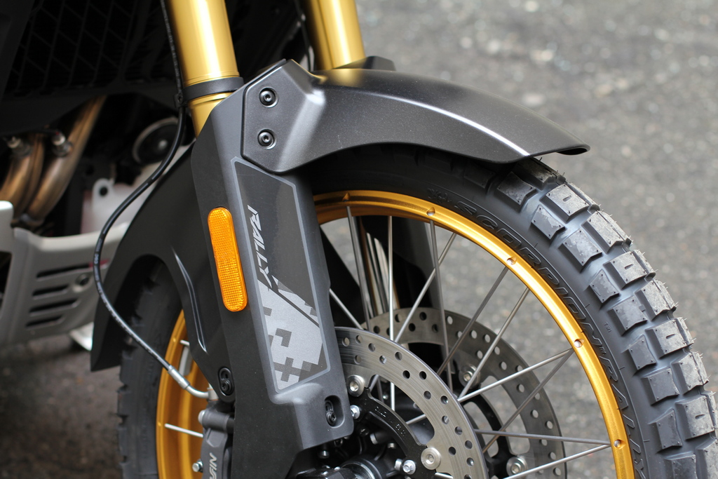 Il parafango anteriore infatti, non è tutt’uno con i parasteli della forcella, ma può facilmente essere rimosso lasciandoli al loro posto. Non solo, il tubo freno anteriore non è con il classico sdoppiatore a T vincolato al parafango, ma è composto da due elementi separati per pinza destra e sinistra agganciati direttamente agli steli della forcella. In questo modo possiamo togliere facilmente il parafango, magari sostituendolo con uno alto per evitare che in condizioni estreme il fango possa bloccare la ruota. Davvero una bella soluzione.