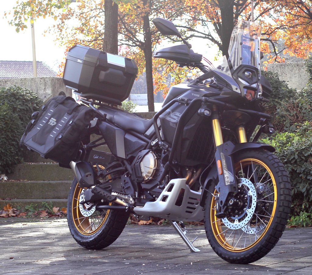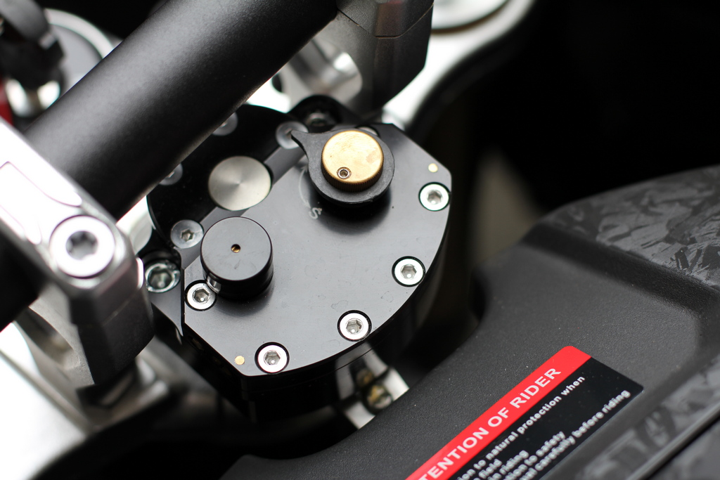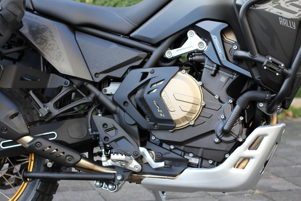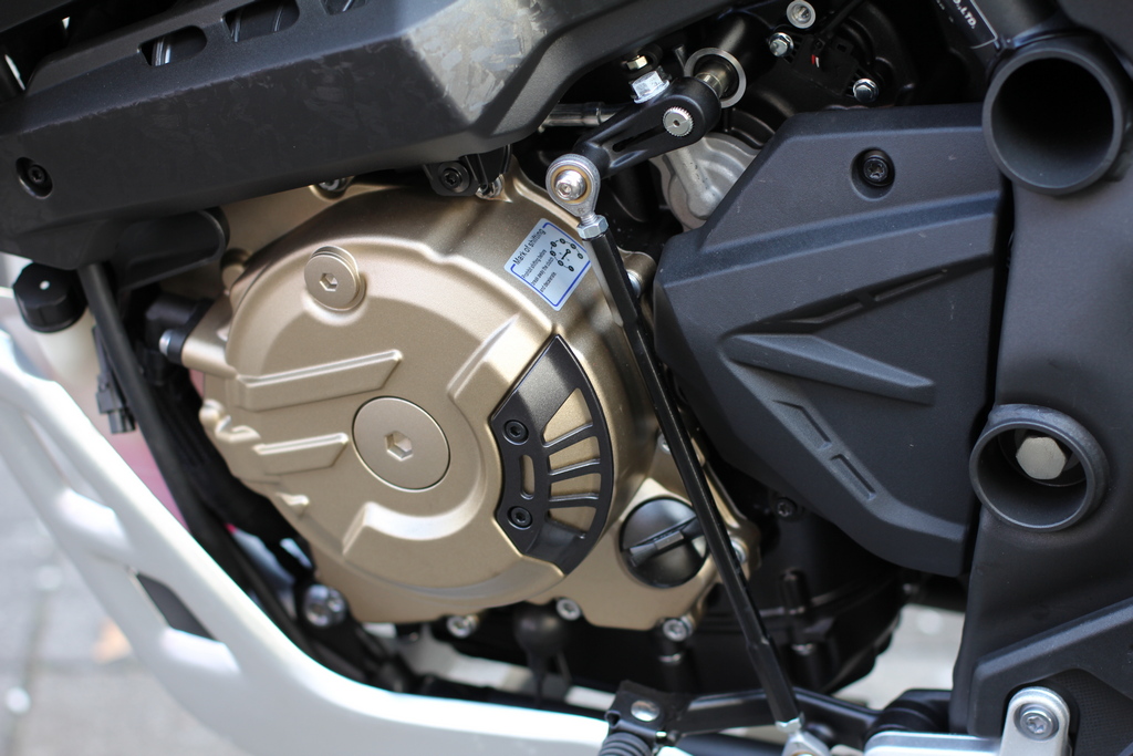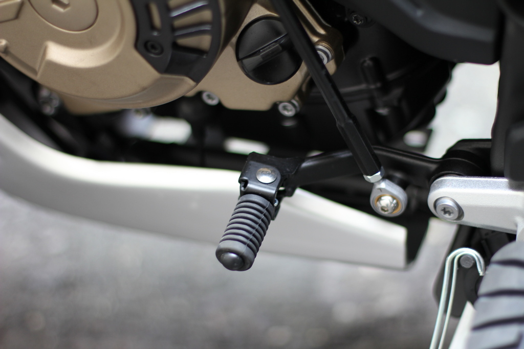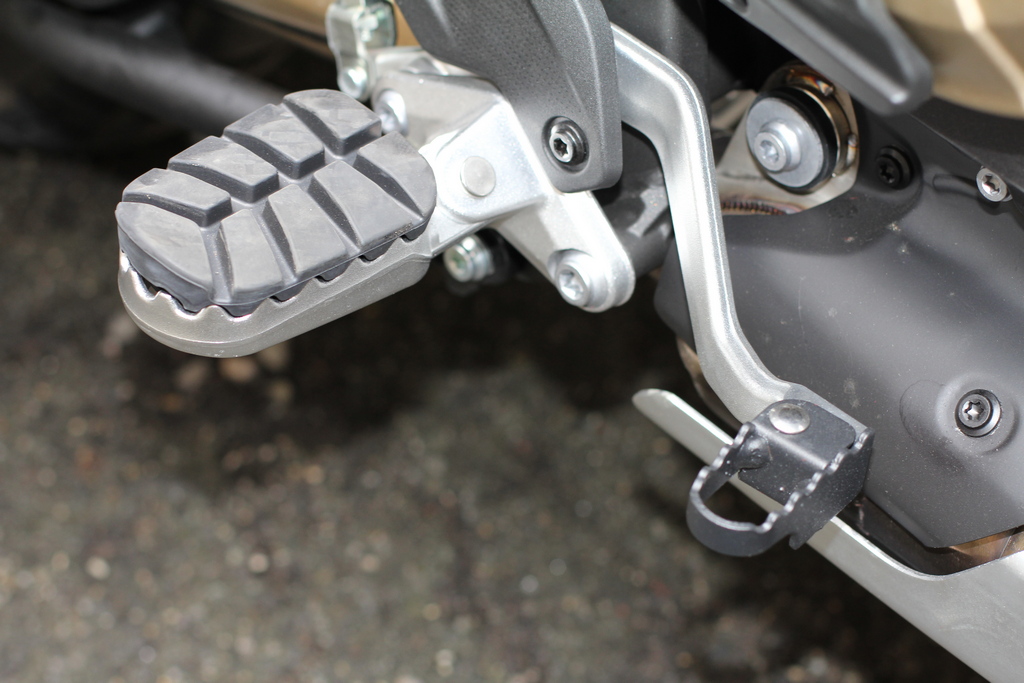 Qualche esempio? Leve di cambio e frizione snodate per non romperle o piegarle in caso di caduta, pedane larghe con gomma rimovibile, protezioni sui carter per evitare di rovinarli quando indossiamo gli stivali da fuoristrada, ammortizzatore di sterzo rotativo per indurire o ammorbidire lo sterzo anche mentre siamo in sella, filtro dell’aria ispezionabile dall’alto e pulibile in pochi minuti, parafango anteriore scomponibile e amovibile facilmente, predisposizione per il parafango alto, cruna catena per scongiurare problemi in fuoristrada, sella doppia perfettamente piatta per facilitare gli spostamenti (e anche il passeggero che non si trova appollaiato al piano superiore esposto all’aria), specchietti richiudibili per non romperli in fuoristrada, paramotore in metallo molto protettivo, possibilità di spostare i riser del manubrio per cucirsi ancora meglio addosso la moto e altro ancora.