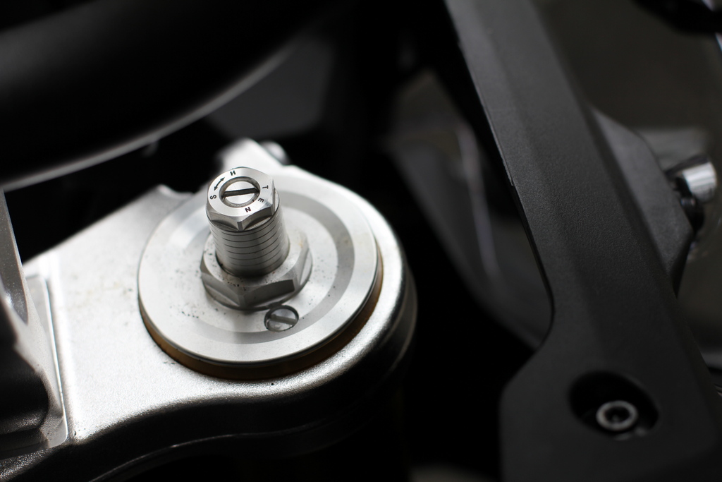 Il telaio è a tubi in acciaio altoresistenziale con culla sdoppiata e altezza utile da terra di 220 mm. Il reparto sospensioni si affida all’anteriore a una forcella Kayaba da 43 mm a steli rovesciati, regolabile in estensione, precarico e compressione con un’escursione di 207 mm, mentre al posteriore troviamo un mono montato su leveraggio progressivo, sempre Kayaba e sempre pluriregolabile, che vanta anche la regolazione rapida del precarico e una corsa di 190 mm. Di serie poi troviamo anche l’ammortizzatore di sterzo rotativo posizionato direttamente al manubrio, che oltre ad essere molto bello esteticamente può facilmente essere regolato anche mentre siamo in sella per indurire lo sterzo quando vogliamo affrontare tratti offroad a velocità elevata, o semplicemente aumentare ulteriormente la stabilità su asfalto penalizzando un po’ la morbidezza dello sterzo. Il fatto di averlo a portata di mano invita a utilizzarlo spesso per adattare ancora meglio la moto al percorso, anche perché sente decisamente i clic e la differenza è evidente. Ma è tutto il reparto sospensioni a lavorare bene. C’è sufficiente escursione ma la forcella non affonda troppo e tutto il comparto assorbe bene le asperità. Probabilmente chi farà fuoristrada a velocità sostenuta dovrà indurirla un po’, ma a noi il setting di serie ci è parso molto equilibrato per un utilizzo 70 strada e 30 fuoristrada.