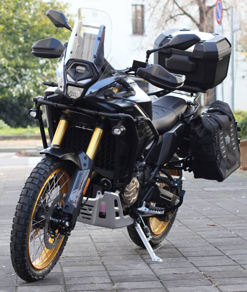 Qualche esempio? Leve di cambio e frizione snodate per non romperle o piegarle in caso di caduta, pedane larghe con gomma rimovibile, protezioni sui carter per evitare di rovinarli quando indossiamo gli stivali da fuoristrada, ammortizzatore di sterzo rotativo per indurire o ammorbidire lo sterzo anche mentre siamo in sella, filtro dell’aria ispezionabile dall’alto e pulibile in pochi minuti, parafango anteriore scomponibile e amovibile facilmente, predisposizione per il parafango alto, cruna catena per scongiurare problemi in fuoristrada, sella doppia perfettamente piatta per facilitare gli spostamenti (e anche il passeggero che non si trova appollaiato al piano superiore esposto all’aria), specchietti richiudibili per non romperli in fuoristrada, paramotore in metallo molto protettivo, possibilità di spostare i riser del manubrio per cucirsi ancora meglio addosso la moto e altro ancora.