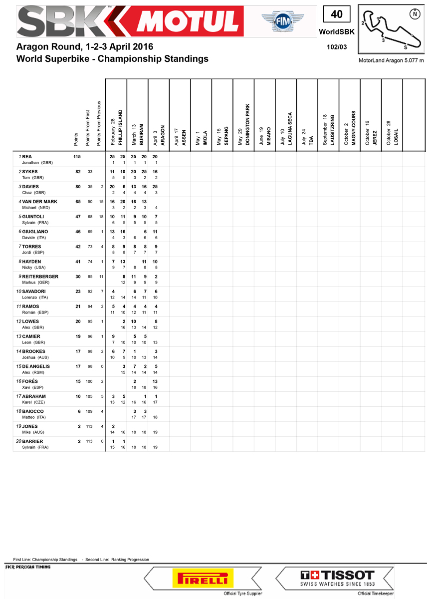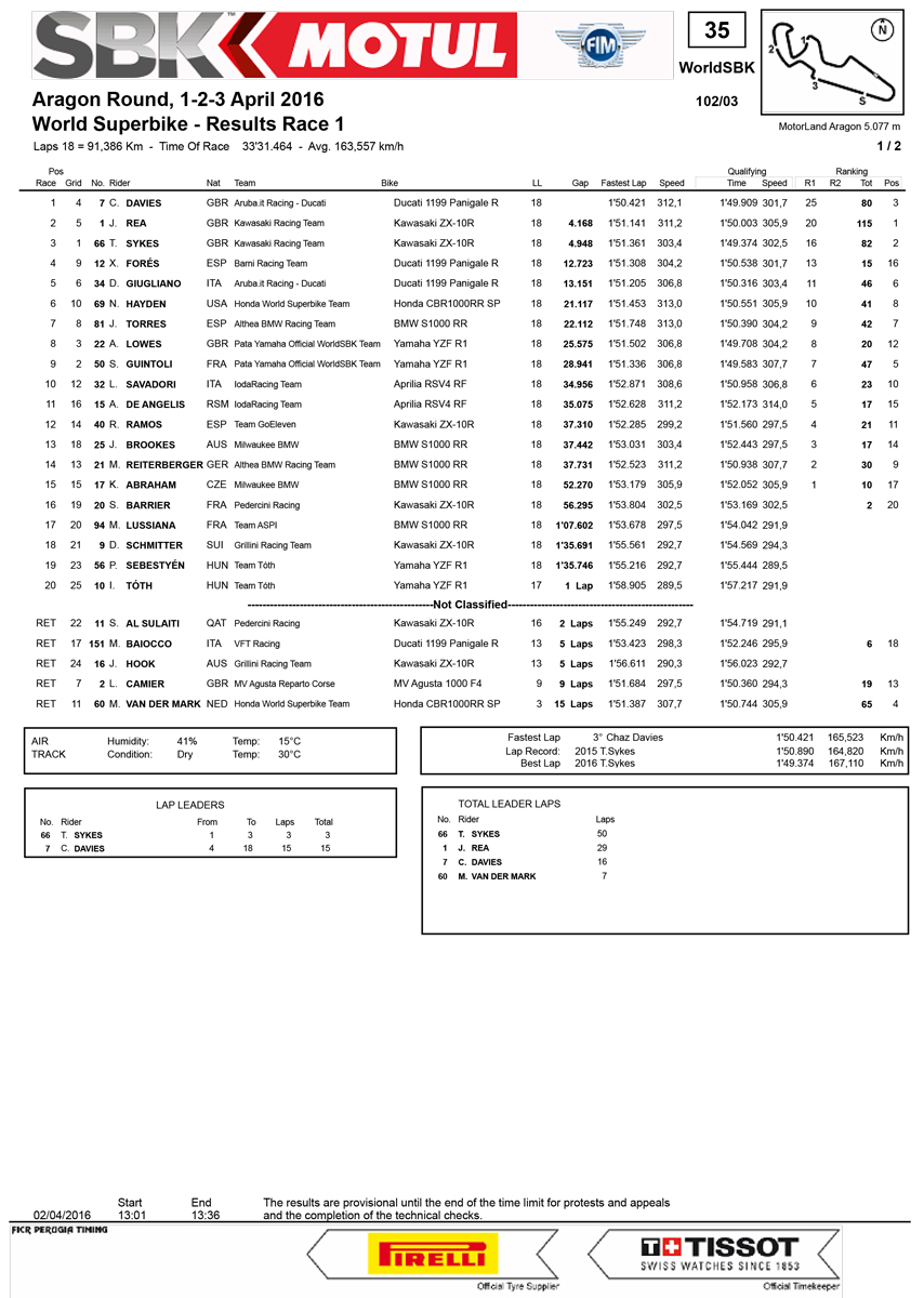 J.Rea chiude in seconda posizione a +4.168 seguito dal compagno di squadra T.Sykes +4.948, ottimo quarto posto per il pilota di casa X.Forés acclamatissimo dal pubblico locale, quinto D.Giugliano che si becca un +13.151 dal compagno di squadra, +21.117 per N.Hayden seguito da Torres a +22.112 e dalle due Yamaha ufficiali di A.Lowes e di S.Guintoli. Dietro di loro troviamo le due Aprilia del Team IodaRacind L.Savadori e A.De Angelis.