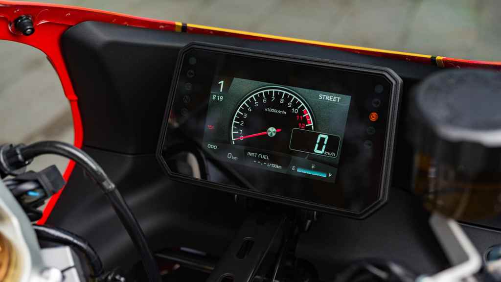 Il nuovo display TFT da cinque pollici a colori è alloggiato nel cruscotto in stile rétro. Anche se i piloti possono scegliere tra quattro diversi temi per adattarsi a diverse esigenze, il tradizionale tema contagiri in stile analogico, ispirato alle moto da corsa di un tempo, migliora davvero le sensazioni di guida.
